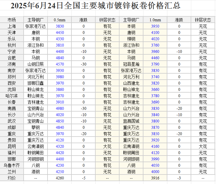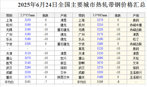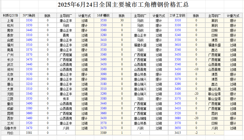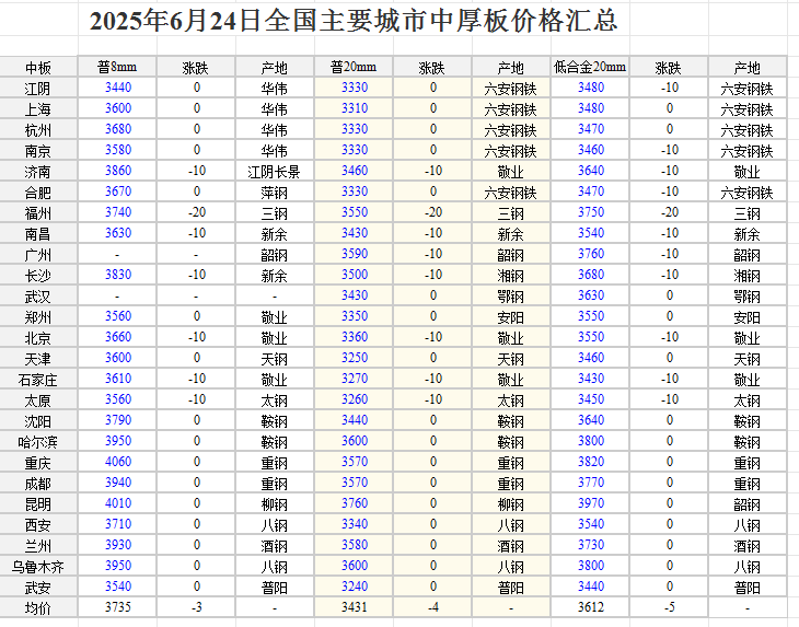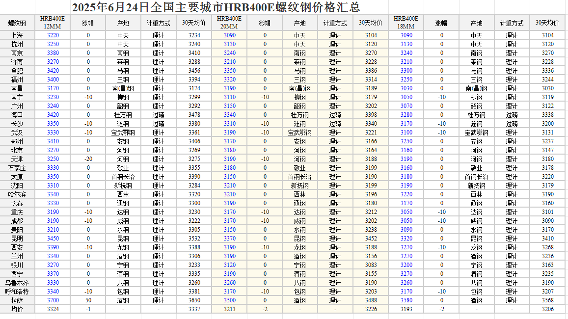 2025年6月24日 全国各地区钢材行情(螺纹钢、盘螺、热轧、高线、中厚板、钢管、型钢)