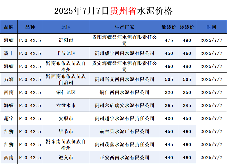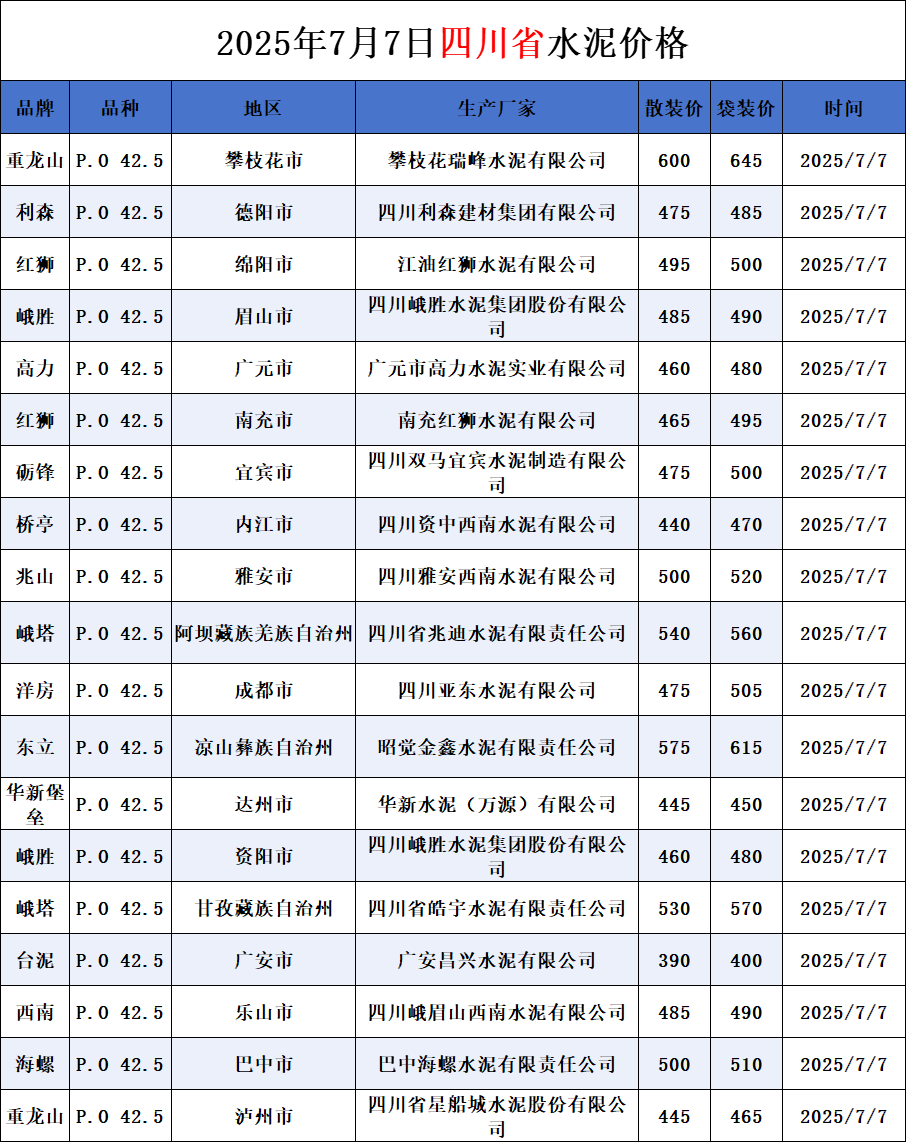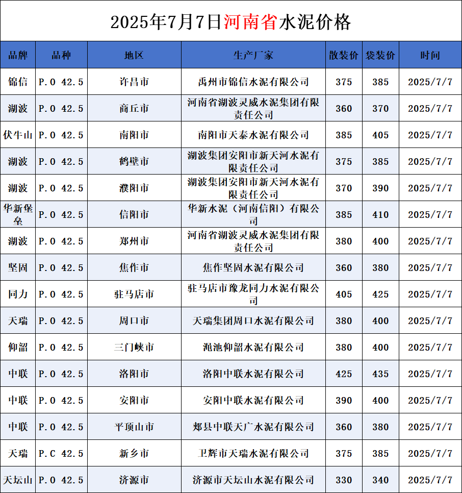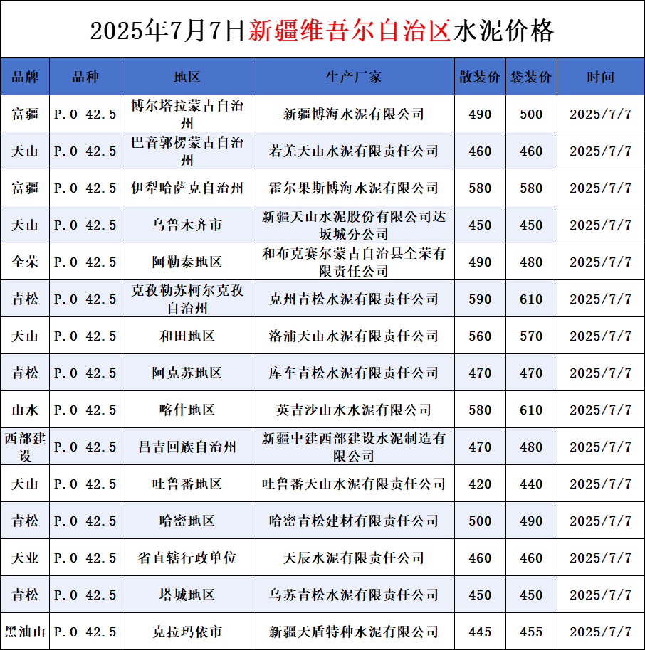 河南、四川、贵州、新疆水泥价格(2025年7月7日)