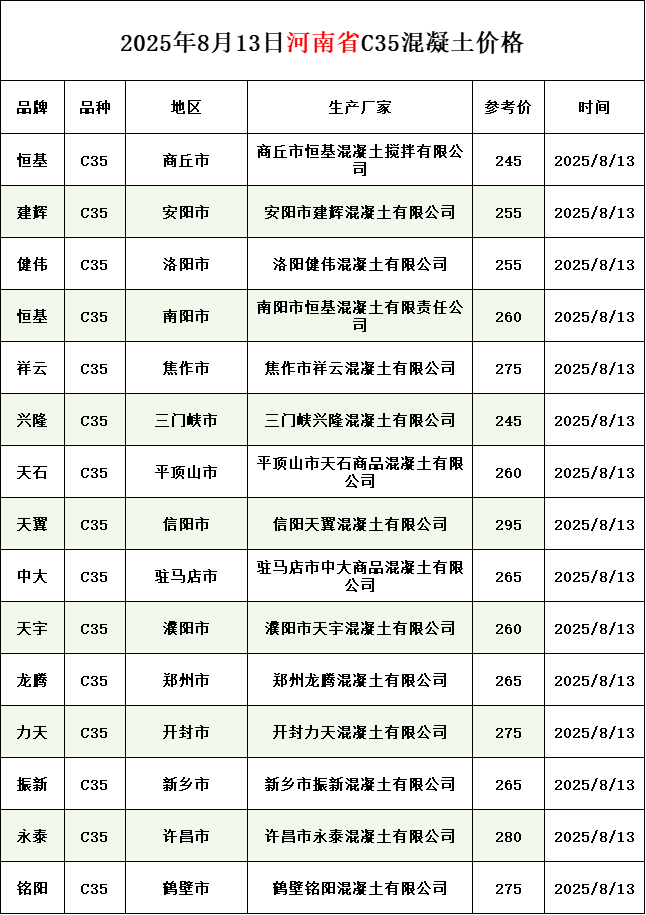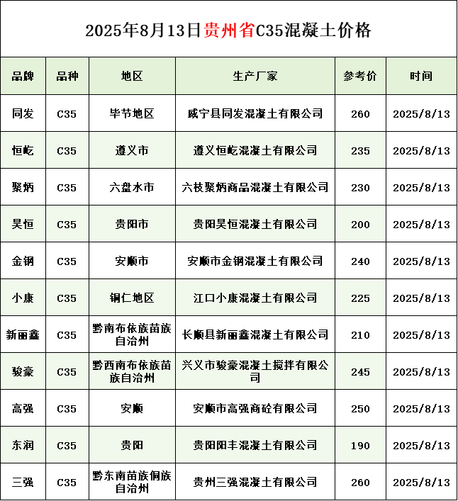 河南、四川、贵州、新疆混凝土价格(2025年8月14日)