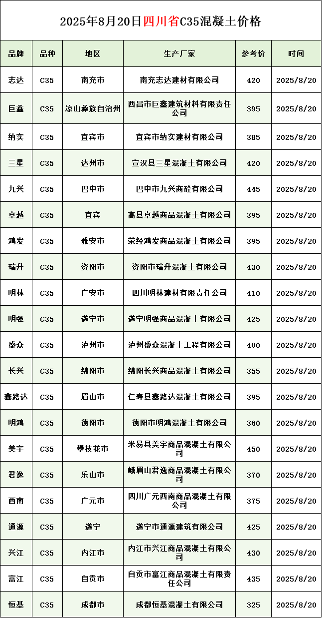 河南、四川、贵州、新疆混凝土价格(2025年8月20日)