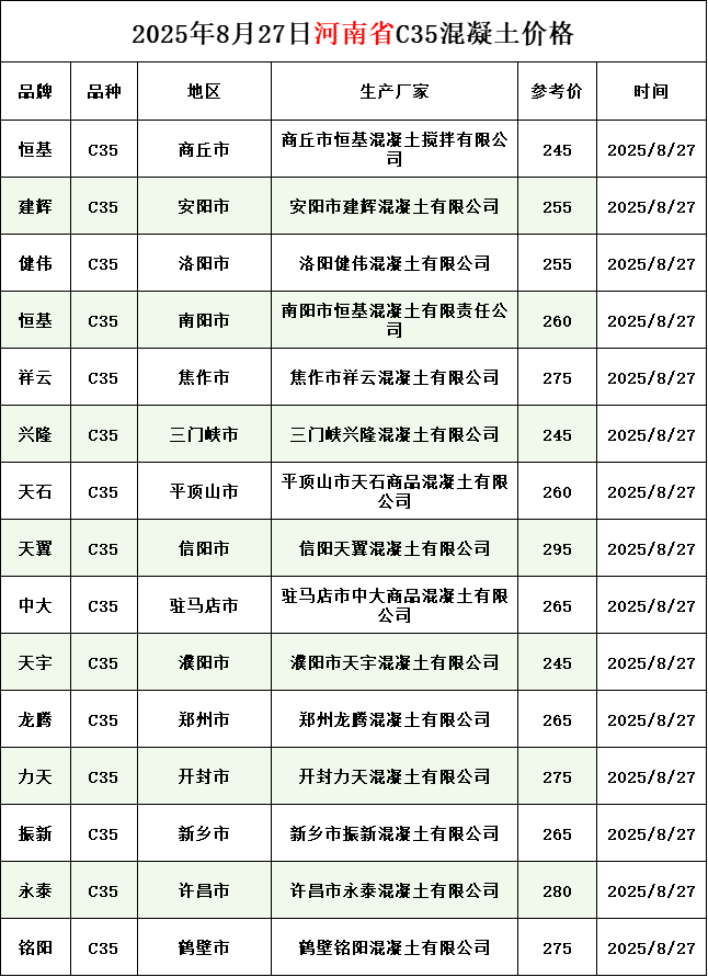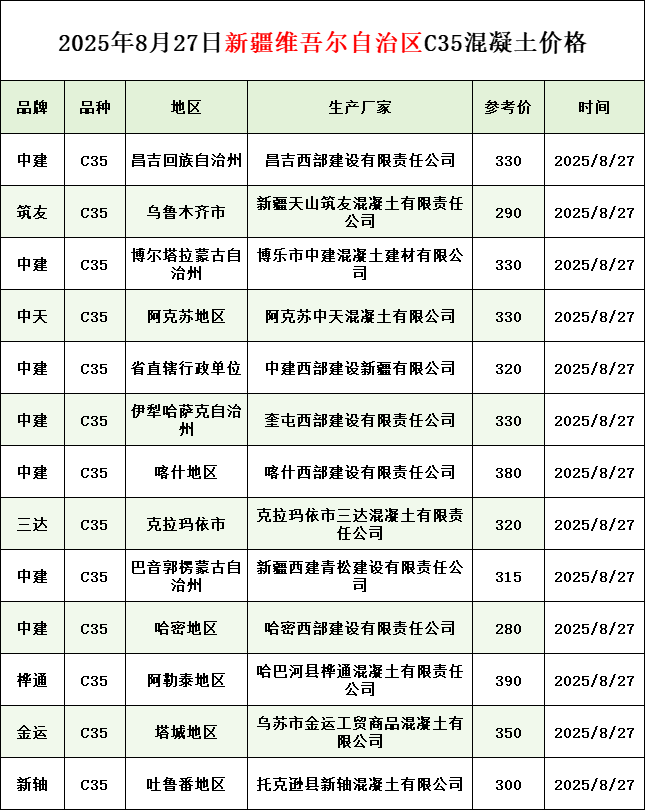 河南、四川、贵州、新疆混凝土价格(2025年8月27日)