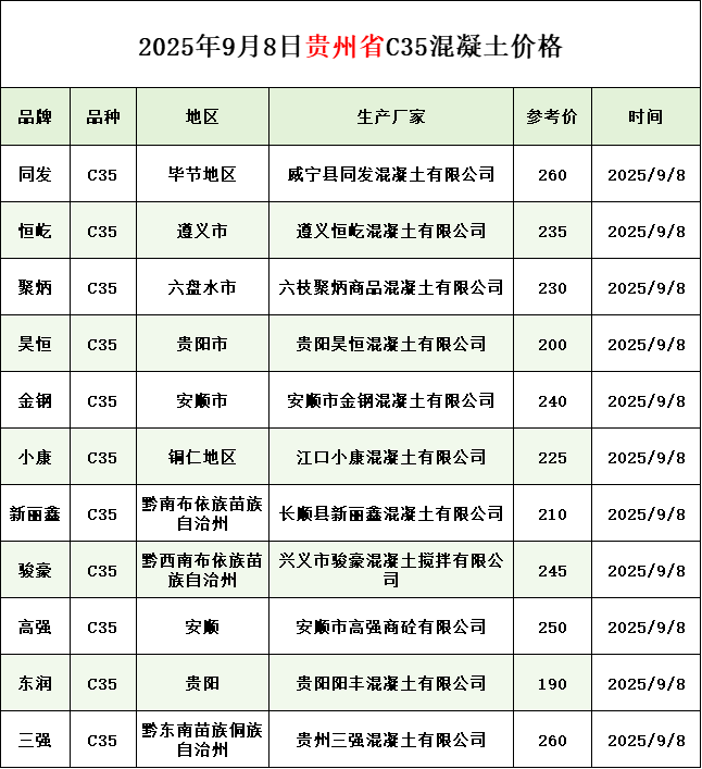 河南、四川、贵州、新疆混凝土价格(2025年9月8日)