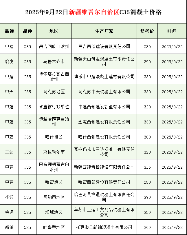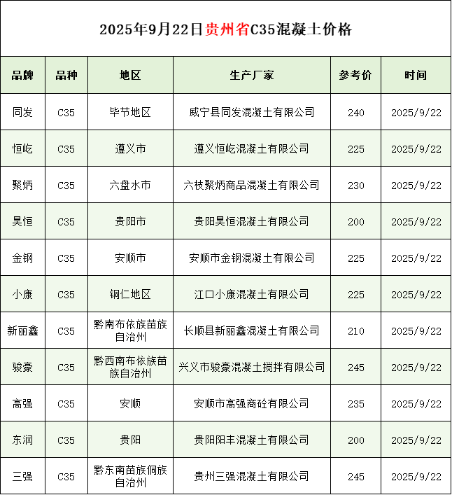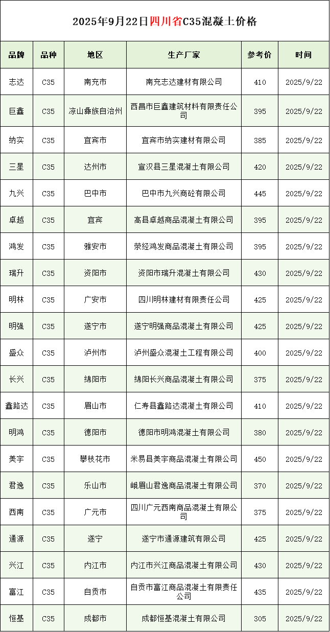 河南、四川、贵州、新疆混凝土价格(2025年9月22日)