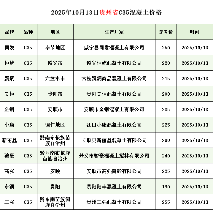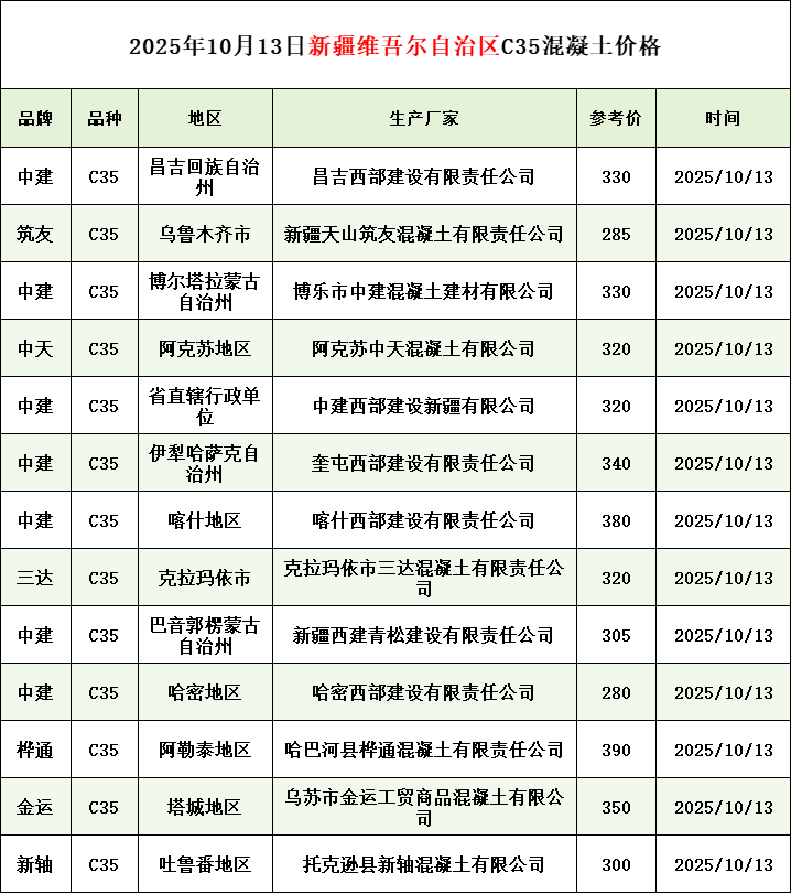 河南、四川、贵州、新疆混凝土价格(2025年10月13日)