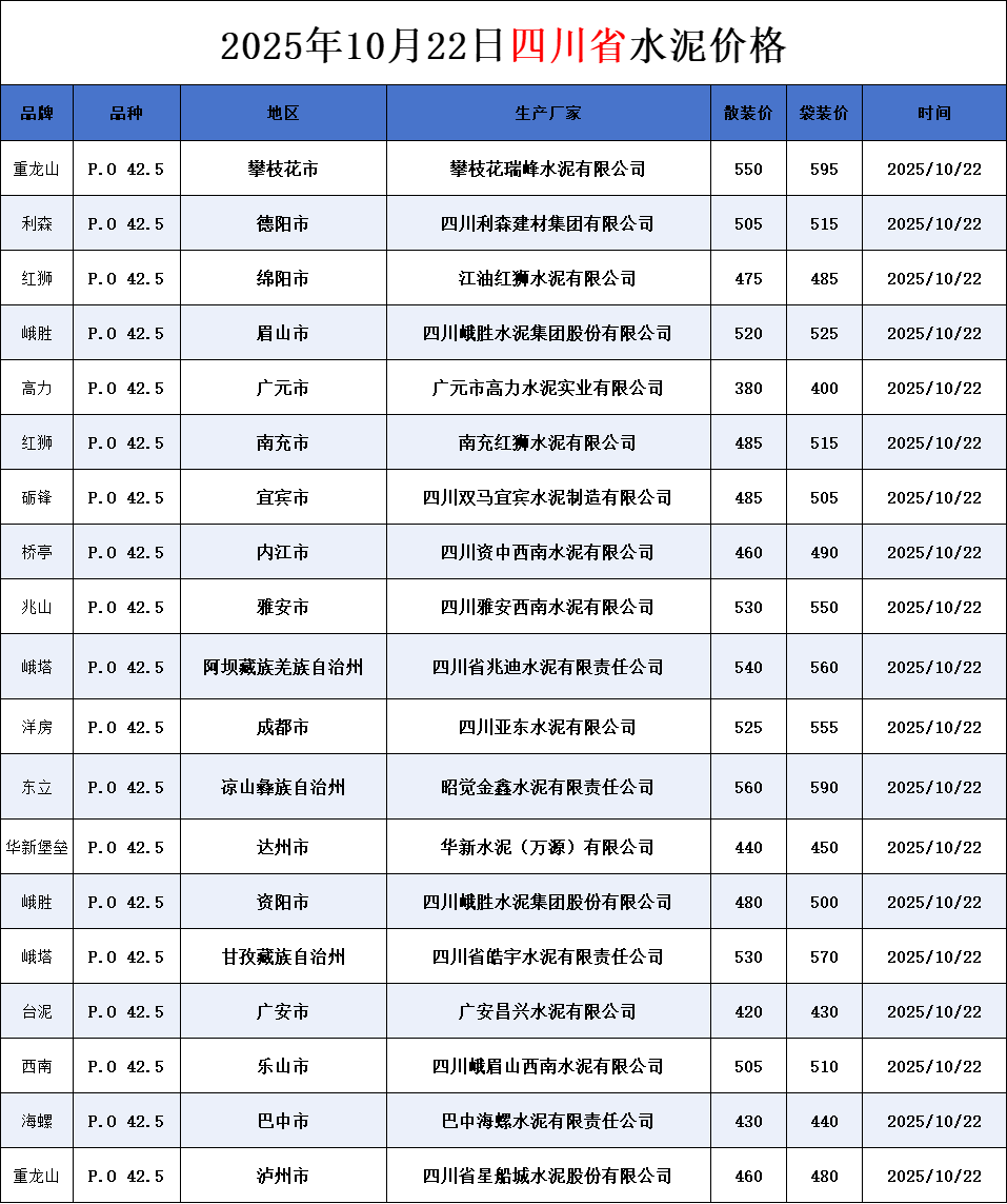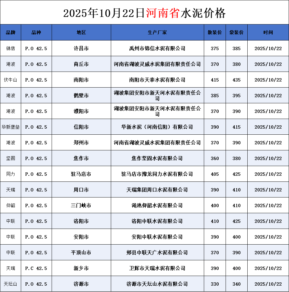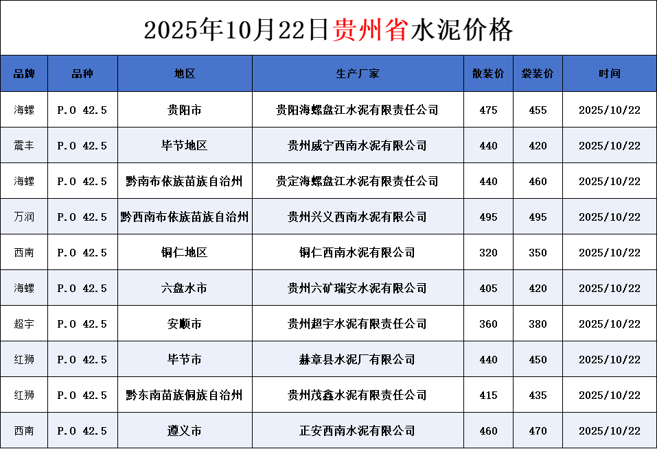 河南、四川、贵州、新疆水泥价格(2025年10月22日)