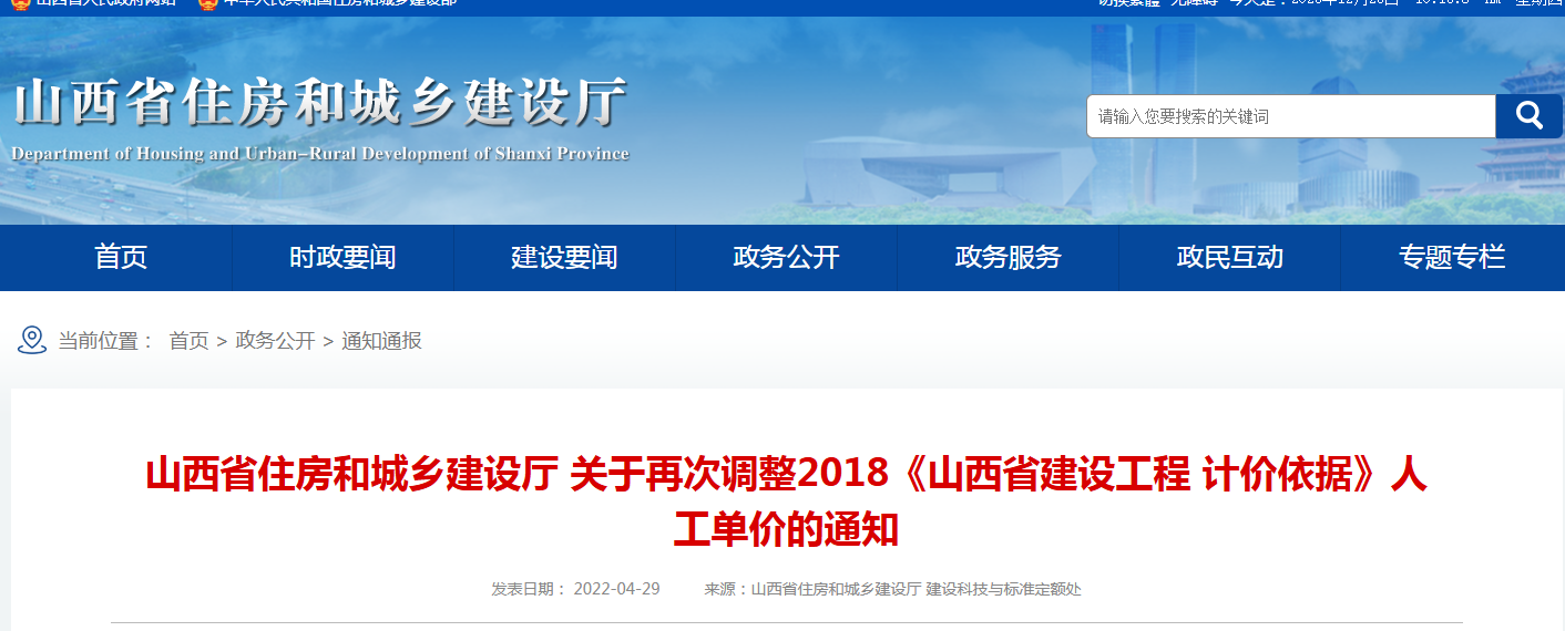 山西省住房和城乡建设厅 关于再次调整2018《山西省建设工程 计价依据》人工单价的通知