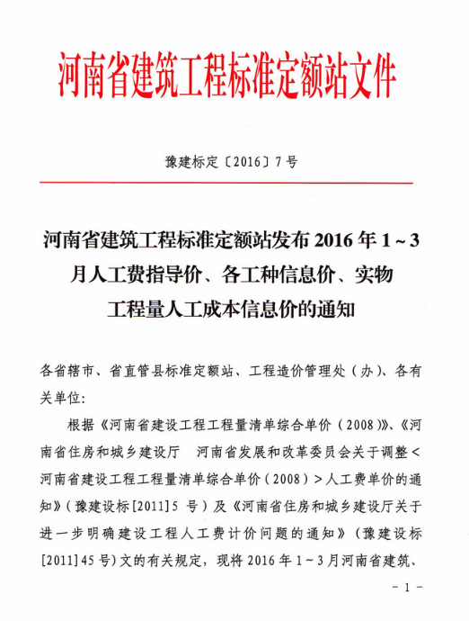 河南省建筑工程标准定额站发布2016年1~3月人工费指导价、各工种信息价、实物工程量人工成本信息价的通知