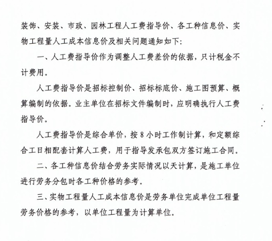 一、人工费指导价作为调整人工费差价的依据,只计税金不计费用。