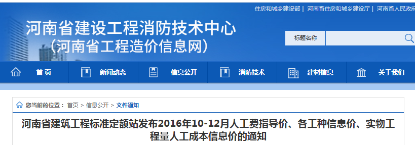 河南省建筑工程标准定额站发布2016年10~12月人工费指导价、各工种信息价、实物工程量人工成本信息价的通知
