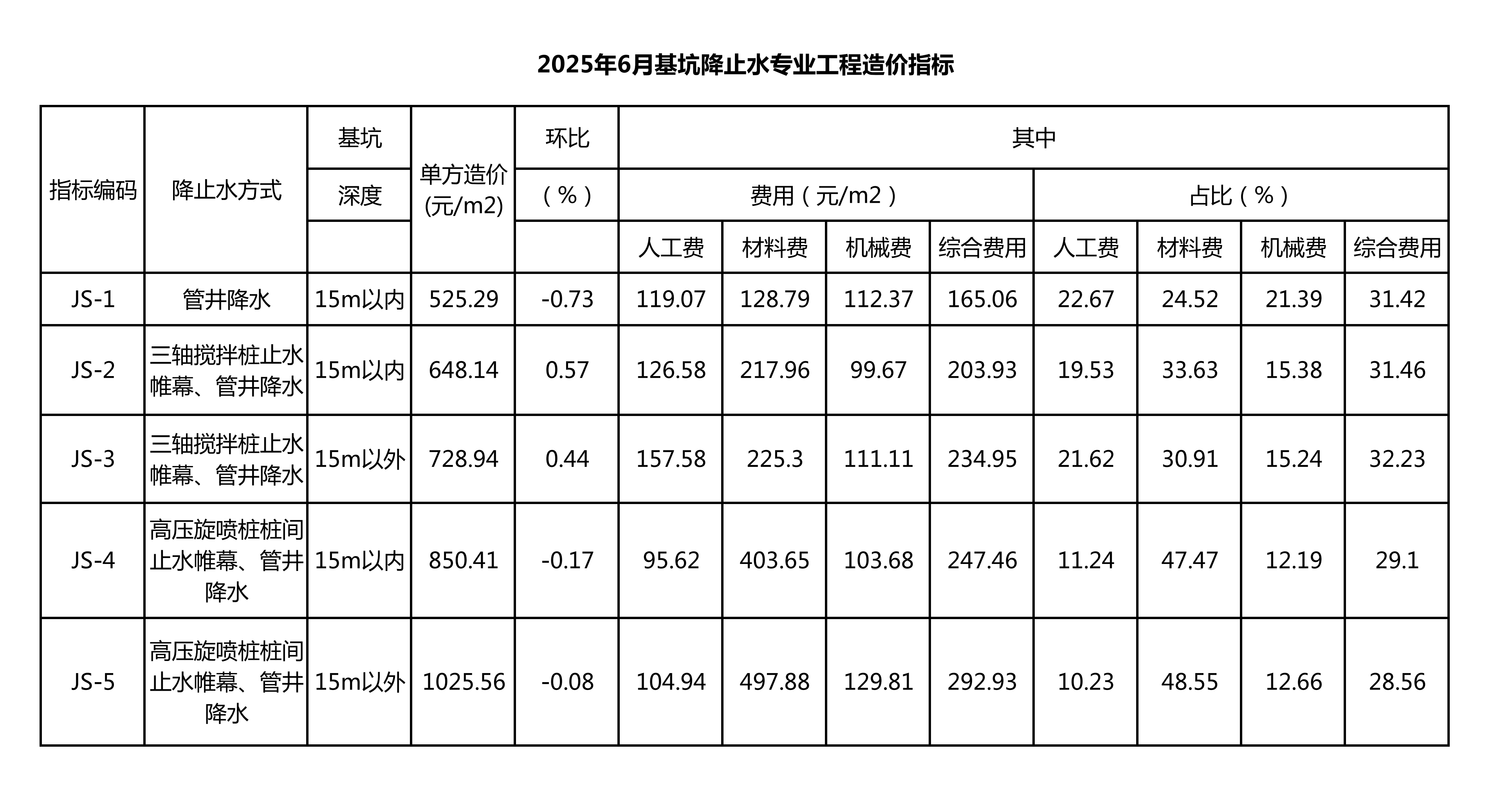 2025年6月基坑与边坡支护专业工程、基坑降止水专业工程、地基基础专业工程造价指标