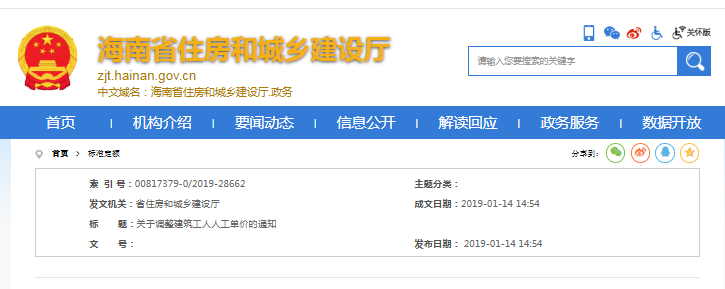 海南省住房和城乡建设厅 关于调整建筑工人人工单价的通知
