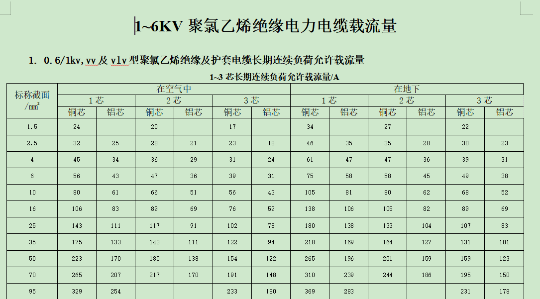 1~6KV聚氯乙烯绝缘电力电缆载流量