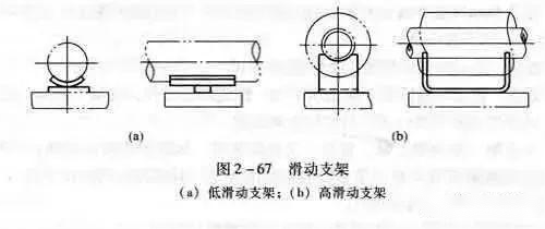 滑动支架有滑动支承面的支架,可约束管道垂直向下方向的位移,不限制管道热胀或冷缩时的水平位移,承受包括自重在内的垂直方向的荷载,如下图所示。滑动支架上管子与支架间的相对运动为滑动。滑动支架又进一步划分为用于不保温管道的低滑动支架和用于保温管道的高滑动支架两种,如图2-67所示。
