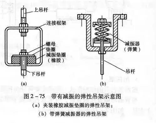 在管道有振动的地方,应设置减振吊架。图2-75所示的减振吊杆就是由夹装的橡胶减振垫圈或弹性减振器来使吊杆具有弹性的。装配式支吊架还有另外一个称呼叫做组合式支吊架或者成品支吊架,其主要可以把管道自身的重量和管道所承受的载荷转移到建筑的结构的承载上,同时还可以很好的控制好管道的移动,避免管道发生震动,保证管道能都安全的投入使用。抗震支吊架是以地震力为主要荷载的抗震支撑系统,针对的是遭遇到设防烈度的地震时能将管道及设备产生的地震作用传到结构体上的一种抗震支撑措施。抗震支架是经抗震加固后的建筑给水排水、消防、供暖、通风、空调、燃气、热力、电力、通讯等机电工程设施,当遭遇到本地区抗震设防烈度的地震发生时,可以达到减轻地震破坏,减少和尽可能防止次生灾害的发生,从而达到减少人员伤亡及财产损失的目的。机电抗震支架是限制附属机电工程设施产生位移,控制设施振动,并将荷载传递至承载结构上的各类组件或装置。