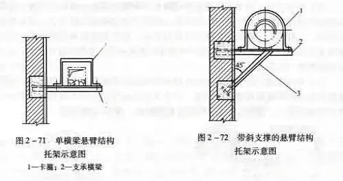 按照其自身的结构形式,管道支架可分为托架、吊架、卡架。当管道沿墙或柱敷设时,可采取托架或卡架来把管道从下面托起或从水平方向上卡住,如图2-71和图2-72所示。