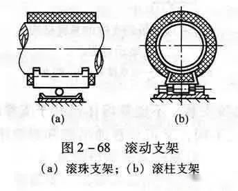 滚动支架是在管道滑托与支架之间加入滚柱或滚珠,使管子与支架间相对运动为滚动运动,从而使滑动摩擦力变为滚动摩擦力,这种支架称为滚动支架,主要用于大管径且无横向位移的管道。按照其滚动构件的不同,又可分为滚珠支架和滚柱支架两种,如图2-68所示。前者可承受较高温度的介质,后者则对管道的摩擦力比较大。