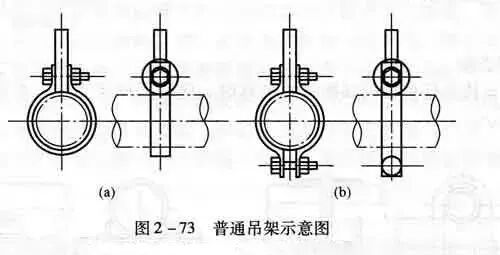 当管道是沿着建筑的楼板或屋面、梁、桁架等安装,不能靠墙体或柱子支撑时,就必须用吊架将管道加以固定。按照吊挂的形式不同,又可分普通吊架和弹性吊架两种,如图2-73和图2-74所示。