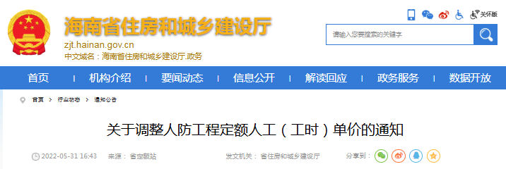 海南省住房和城乡建设厅关于调整人防工程定额人工(工时)单价的通知(点击下载文件)