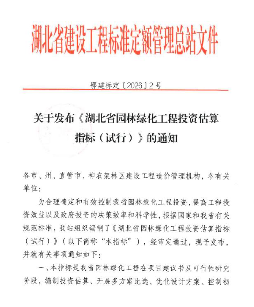关于发布2026《湖北省园林绿化工程投资估算指标(试行)》的通知(点击下载文件)