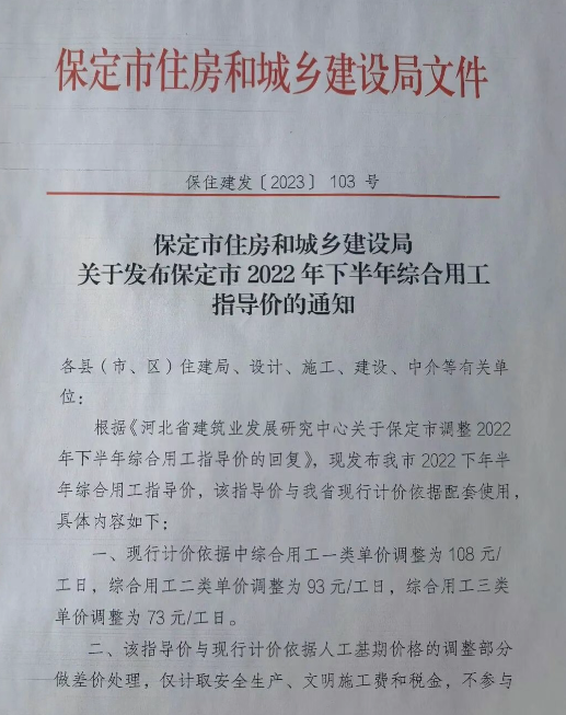 保定市住房和城乡建设局关于发布保定市2022年下半年综合用工指导价的通知