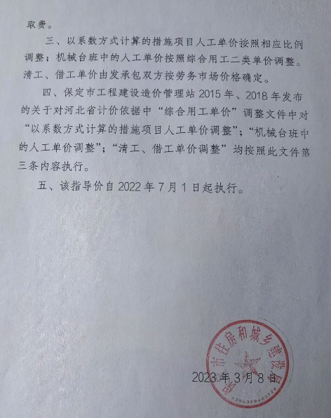 四、保定市工程建设造价管理站2015年、2018年发布的关于对河北省计价依据中“综合用工单价”调整文件中对“以系数方式计算的措施项目人工单价调整”;“机械台班中的人工单价调整”;“清工、借工单价调整”均按照此文件第三条内容执行。