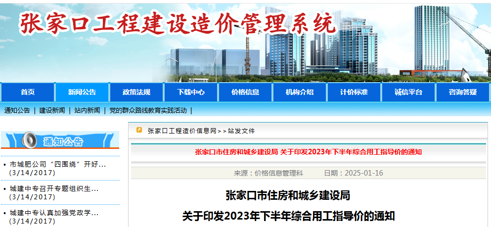 张家口市住房和城乡建设局关于印发2023年下半年综合用工指导价的通知