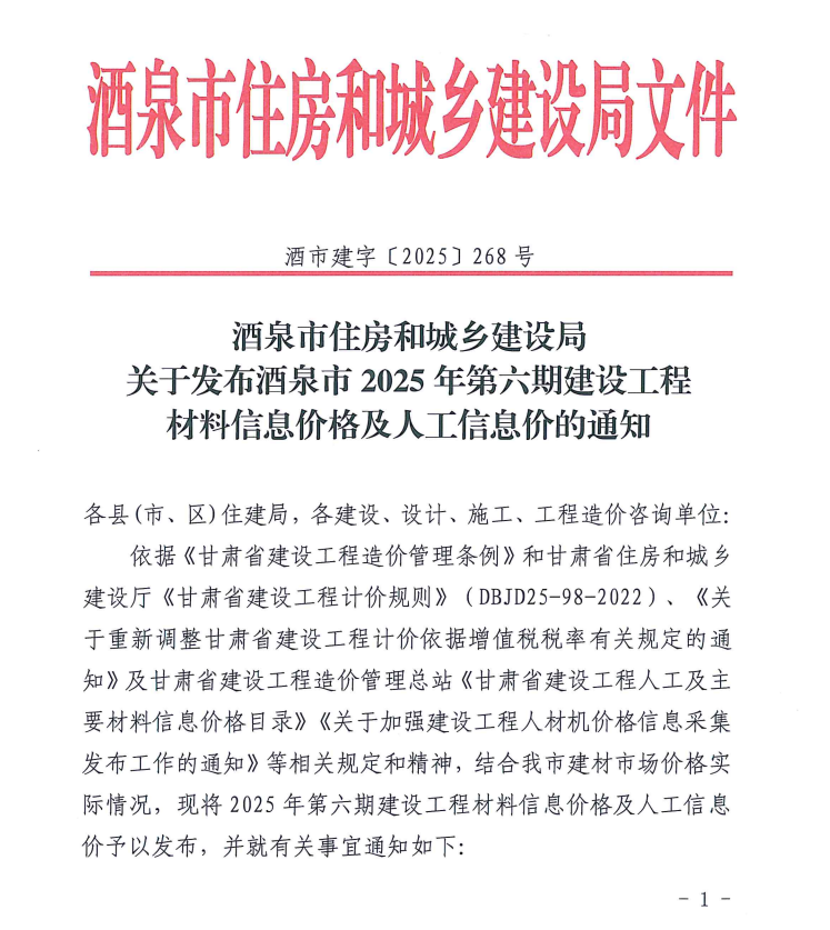 酒泉市住房和城乡建设局关于发布酒泉市2025年第六期建设工程人工信息价的通知
