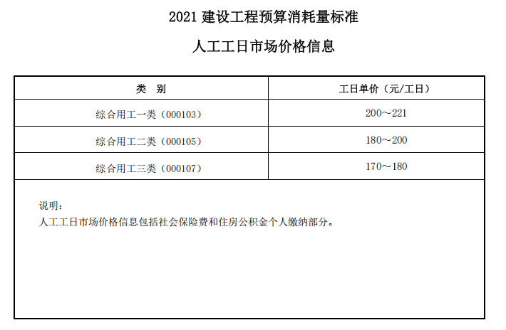 2. 2021 建设工程预算消耗量标准人工工日市场价格信息