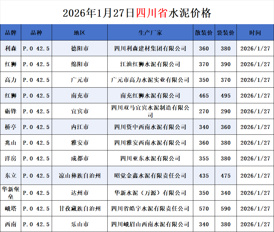 2026年1月27日四川省水泥价格