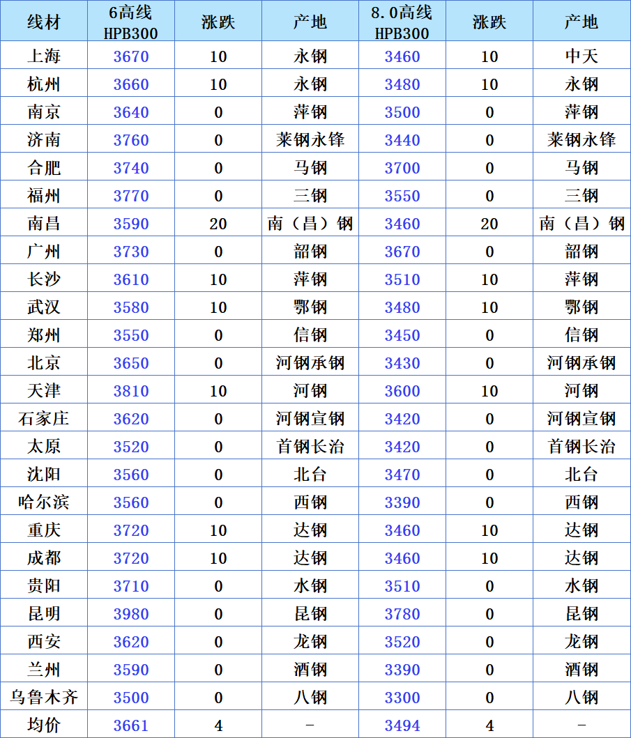 当前国内高线市场整体稳中有涨,南昌地区 6.0 高线和 8.0 高线价格涨幅均达 20 元 / 吨,上海、杭州、长沙等多地也出现 10 元 / 吨的上涨。全国均价方面,6.0 高线 HPB300 报 3661 元 / 吨、8.0 高线 HPB300 报 3494 元 / 吨,均较此前上涨 4 元 / 吨,多数城市价格保持稳定。