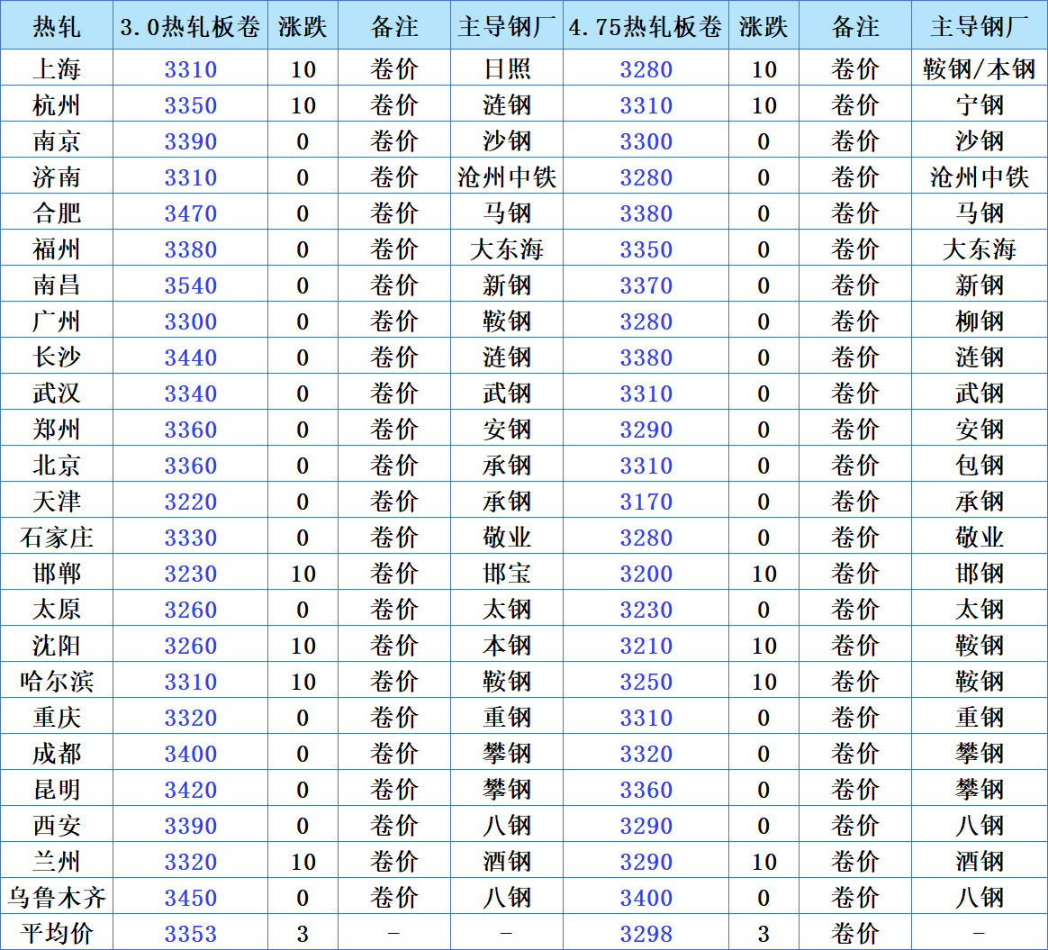 当前国内热轧板卷市场呈现局部上涨、整体平稳的态势,上海、杭州、邯郸、沈阳、哈尔滨、兰州等城市的 3.0 热轧板卷和 4.75 热轧板卷价格均出现 10 元 / 吨的上涨。全国均价方面,3.0 热轧板卷报 3353 元 / 吨,4.75 热轧板卷报 3298 元 / 吨,均较此前上涨 3 元 / 吨,多数城市价格维持稳定。