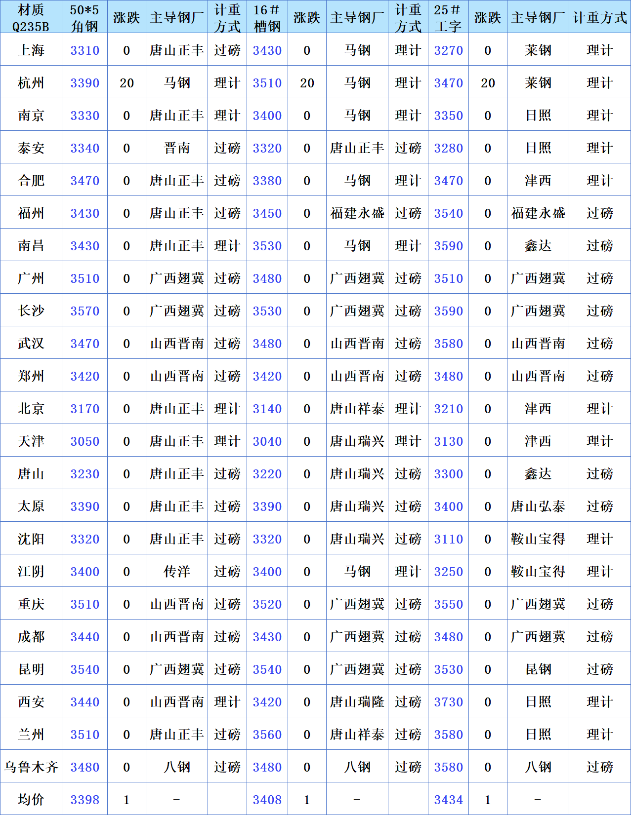 不同城市的供货钢厂、计重方式与价格存在差异,其中角铁均价为 3398 元,槽钢均价为 3408 元,工字钢均价为 3434 元,整体价格波动幅度较小。