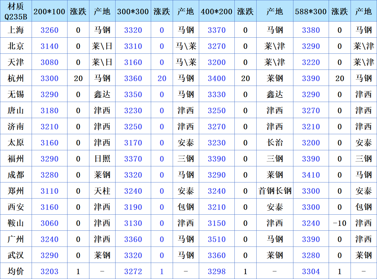 杭州地区各规格价格均出现 20 元的小幅上涨,鞍山 588*300 规格价格有 10 元的小幅下跌,整体市场价格相对平稳。