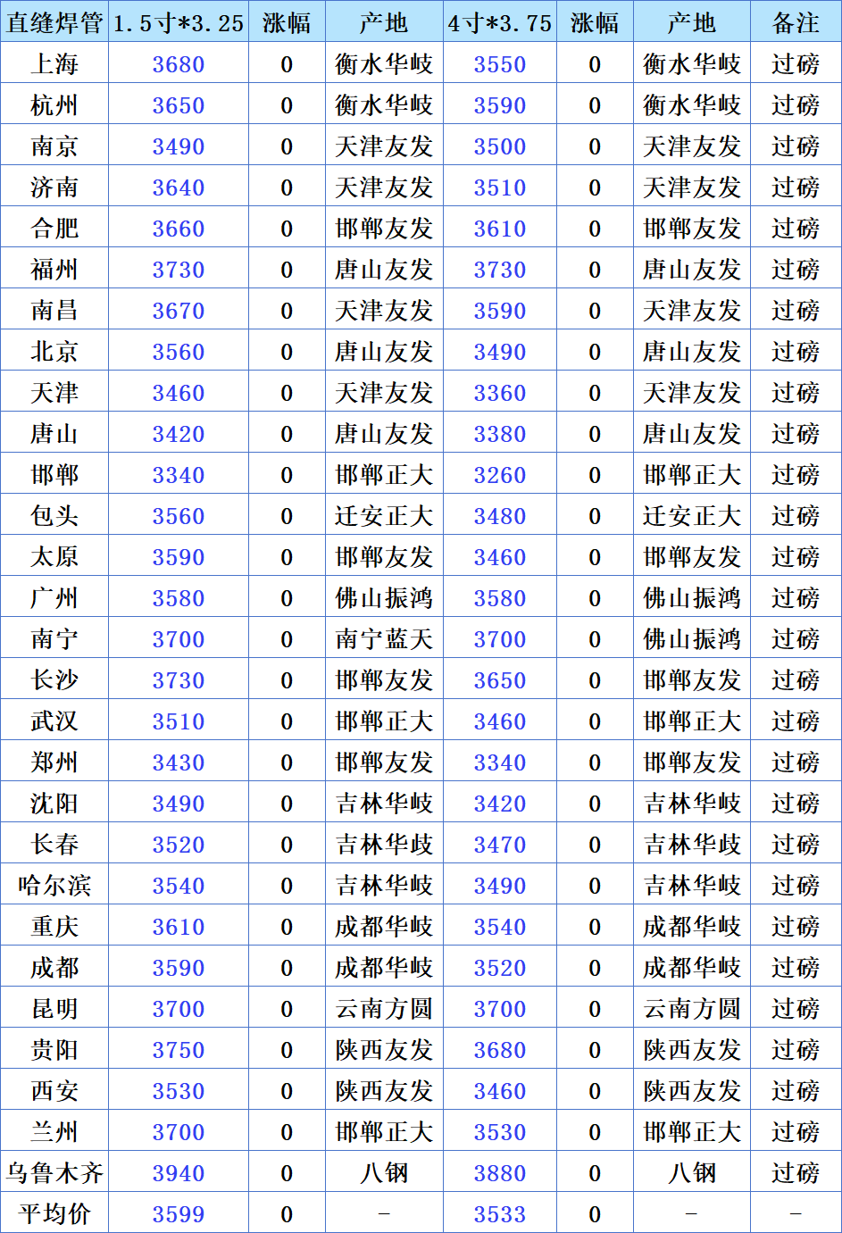 整体市场价格保持稳定。不同城市的供货产地存在差异,所有规格均采用过磅计重,其中乌鲁木齐的两个规格报价在全国城市中相对偏高。