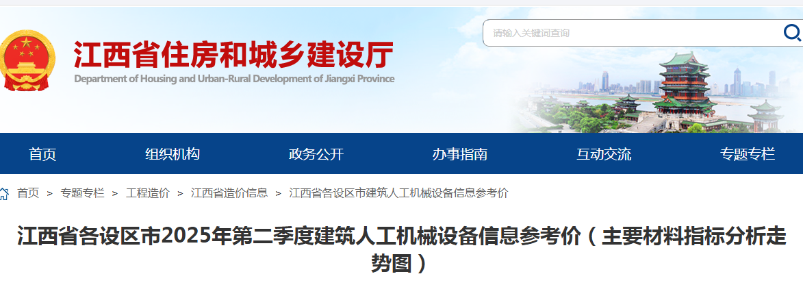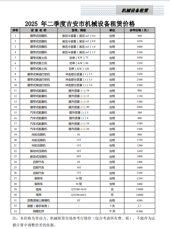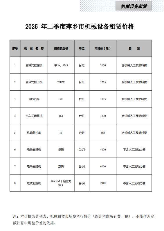 江西省各设区市2025年第二季度建筑人工机械设备信息参考价(点击下载文件)