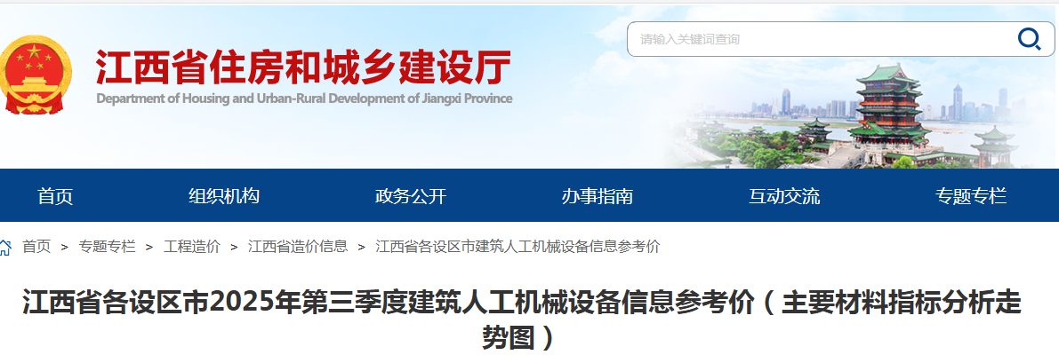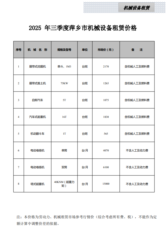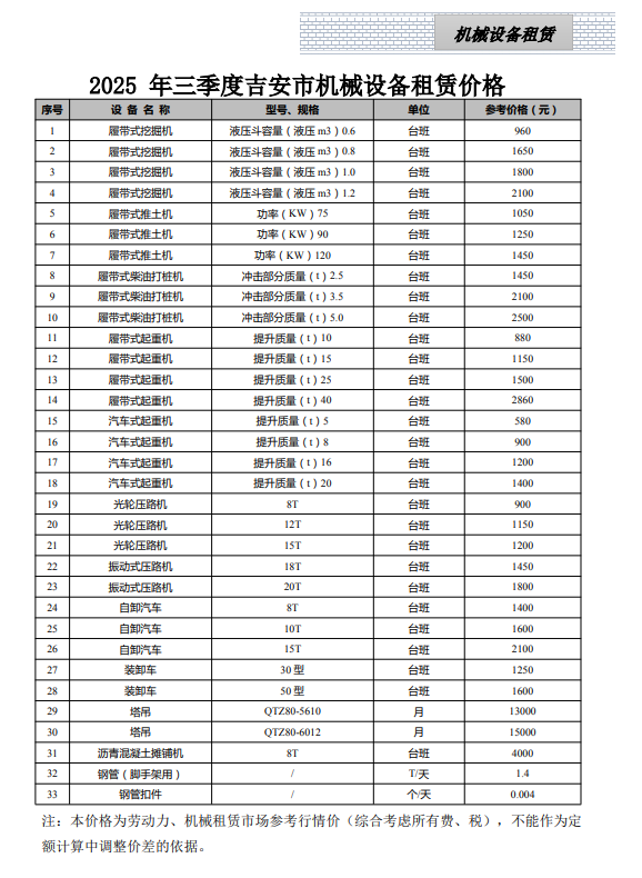 江西省各设区市2025年第三季度建筑人工机械设备信息参考价(点击下载文件)