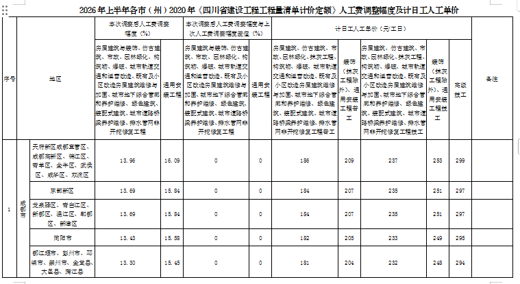 附件:2026年上半年各市(州)2020年《四川省建设工程工程量清单计价定额》人工费调整幅度及计日工人工单价