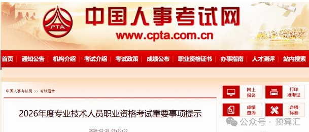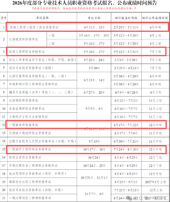 刚刚,中国人事考试网发布《2026年度专业技术人员职业资格考试重要事项提示》,预告了各项考试的报名时间、出成绩时间和报名流程。原文链接: