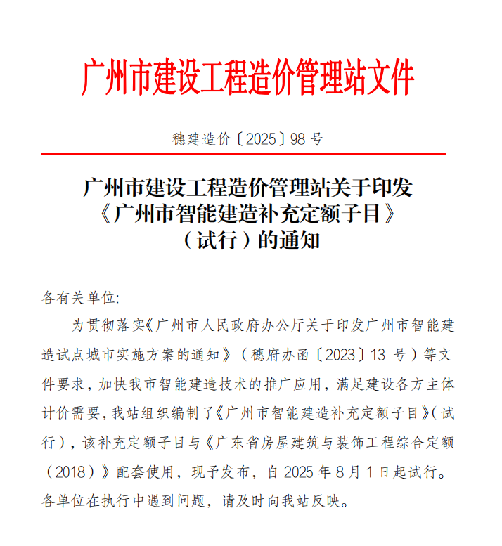 为贯彻落实《广州市人民政府办公厅关于印发广州市智能建造试点城市实施方案的通知》(穗府办函〔2023〕13号)等文件要求,加快我市智能建造技术的推广应用,满足建设各方主体计价需要,我站组织编制了《广州市智能建造补充定额子目》(试行),该补充定额子目与《广东省房屋建筑与装饰工程综合定额(2018)》配套使用,现予发布,自2025年8月1日起试行。各单位在执行中遇到问题,请及时向我站反映。