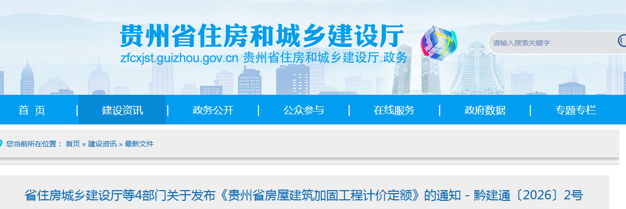 省住房城乡建设厅等4部门关于发布《贵州省房屋建筑加固工程计价定额》的通知 - 黔建通〔2026〕2号