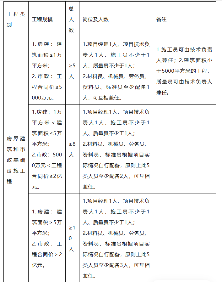 房屋建筑和市政基础设施工程 | 1.房建:建筑面积≤1万平方米; 2.市政:工程合同价≤5000万元。 | ≥5人 | 1.项目经理1人、项目技术负责人1人、施工员不少于1人、质量员不少于1人; 2.材料员、机械员、劳务员、资料员、标准员至少配备1人,可互相兼任。 | 1.施工员可由技术负责人兼任;2.建筑面积小于5000平方米的工程,质量员可由技术负责人兼任。 |