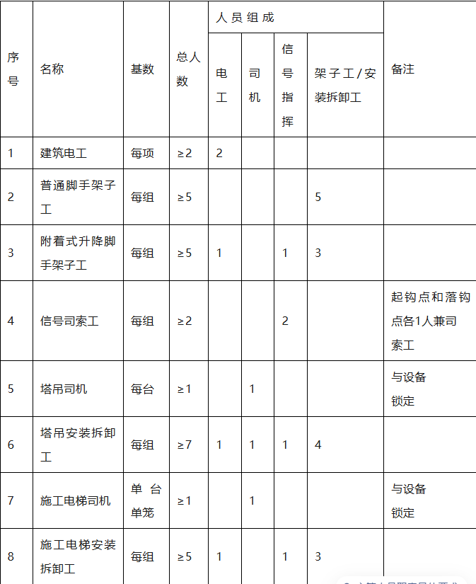 3.建筑施工特种作业人员。包括建筑电工、建筑架子工、建筑起重信号司索工、建筑起重机械司机、建筑起重机械安装拆卸工、高处作业吊篮安装拆卸工和经省级以上人民政府住房城乡建设主管部门认定的其他特种作业人员等。