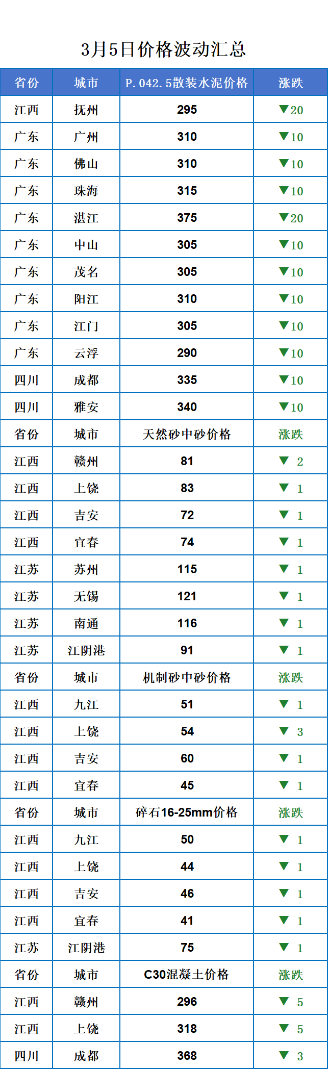 3月5日全国砂石行情主跌,主要涉及江西、江苏。
