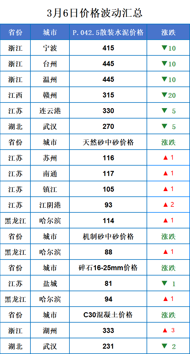 3月6日全国水泥、砂石、混凝土行情