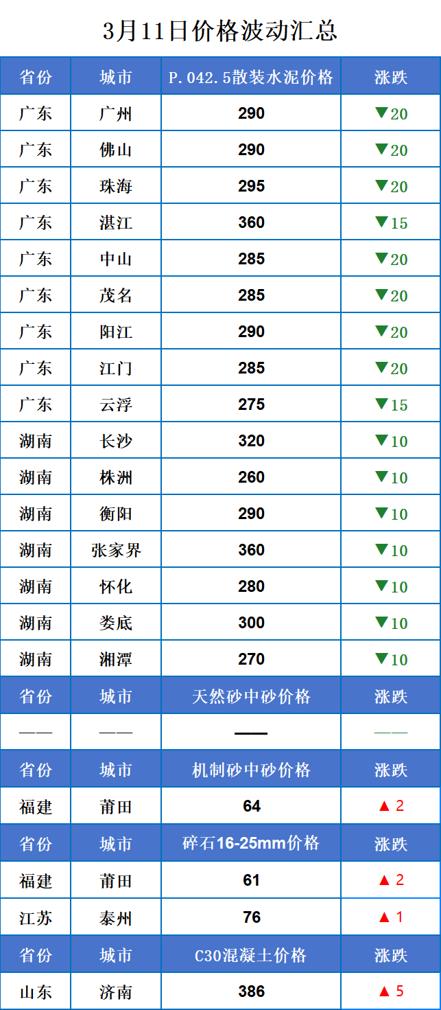 3月11日全国水泥行情主跌,跌价地区集中在广东和湖南。