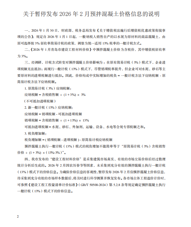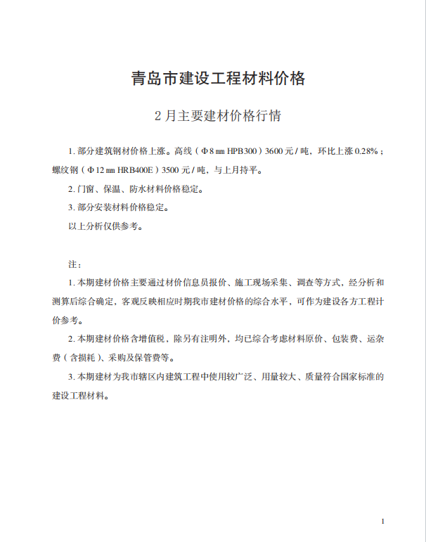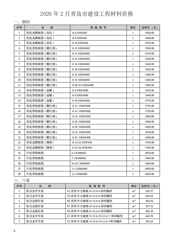 【青岛市】2026年2月份建设工程材料价格及造价指数