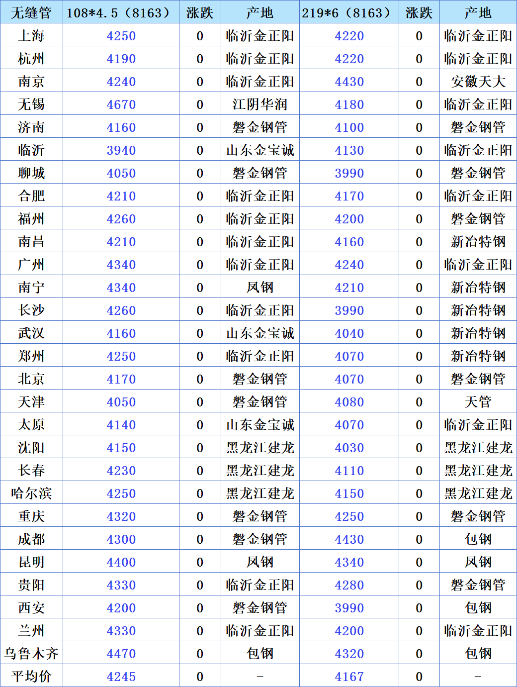 今日无缝管市场价格整体持稳,产地资源以临沂金正阳、磐金钢管等为主,西南、西北区域报价略高,整体市场呈现观望僵持、价格平稳运行的态势。