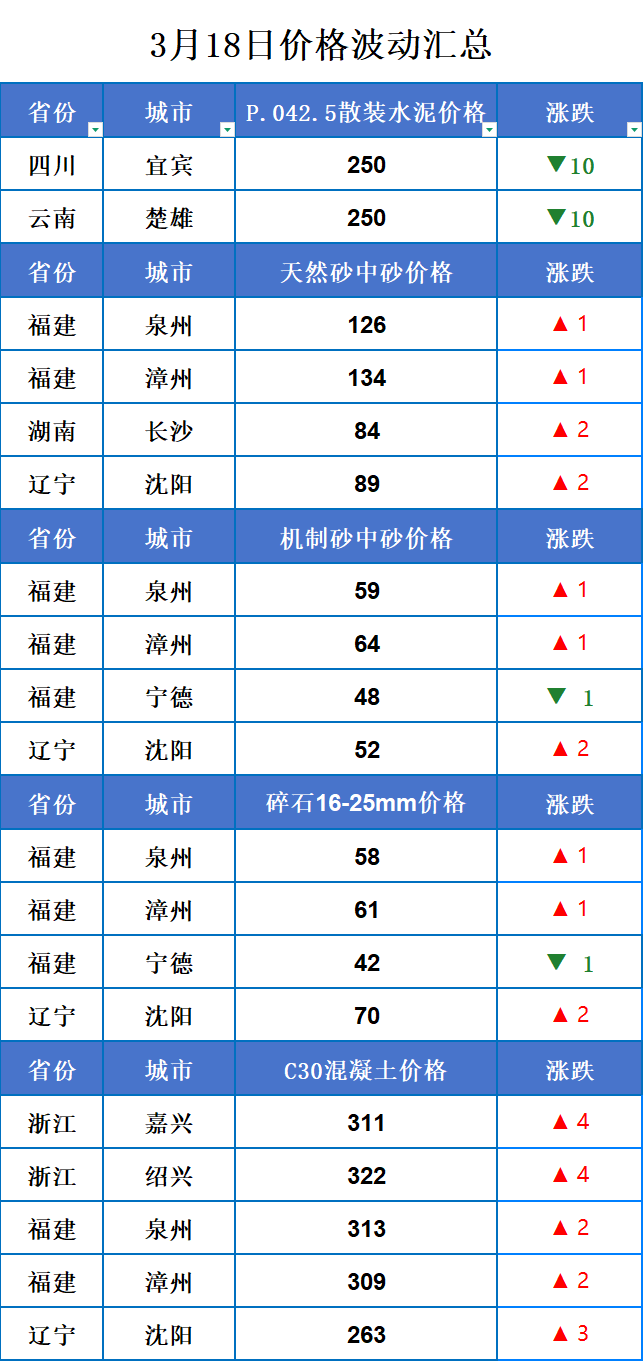 3月18日全国砂石行情主涨,涨价地区主要集中在福建。