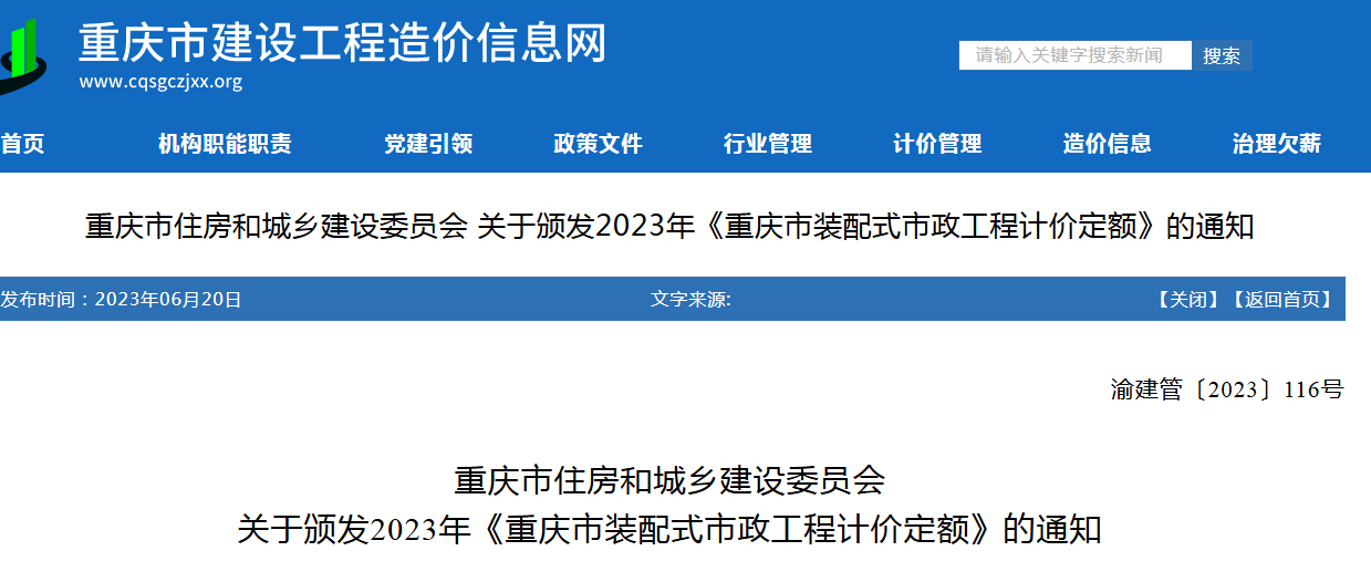 关于颁发2023年《重庆市装配式市政工程计价定额》的通知