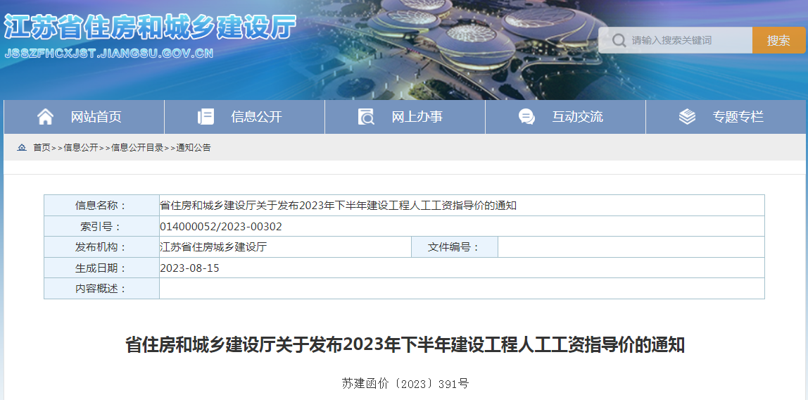 江苏《省住房和城乡建设厅关于发布2023年下半年建设工程人工工资指导价的通知》点击下载附件